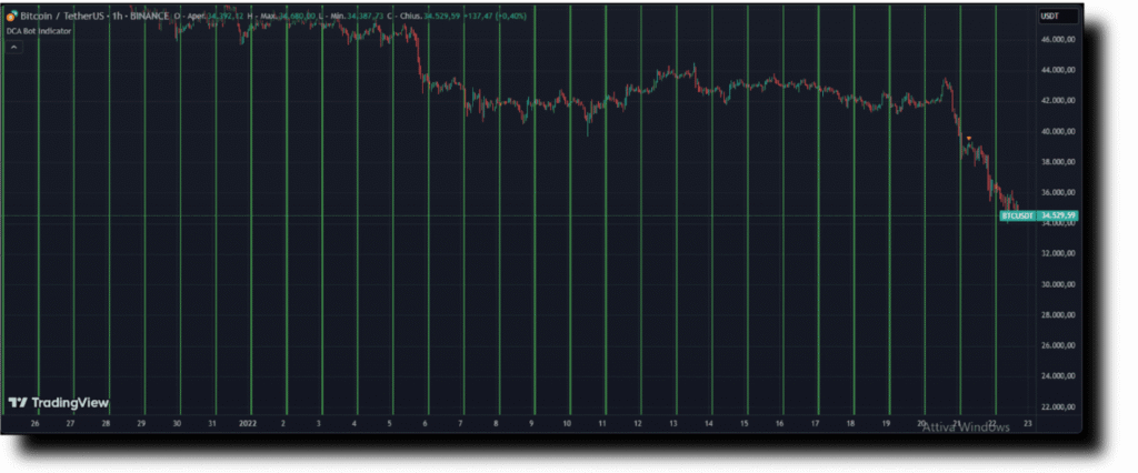 Il DCA Bot Indicator è uno strumento per strategie di Dollar Cost Averaging a lungo termine, operante su timeframe 1H. Genera alert in orari e giorni specifici (giornalieri, settimanali o mensili) per indicare il momento d’acquisto, senza gestire l’uscita. È personalizzabile con messaggi per automazioni di trading e può essere abbinato al Bias Analyzer per individuare il momento ottimale d’acquisto. Le impostazioni permettono di definire orario, giorno della settimana o del mese in cui acquistare.