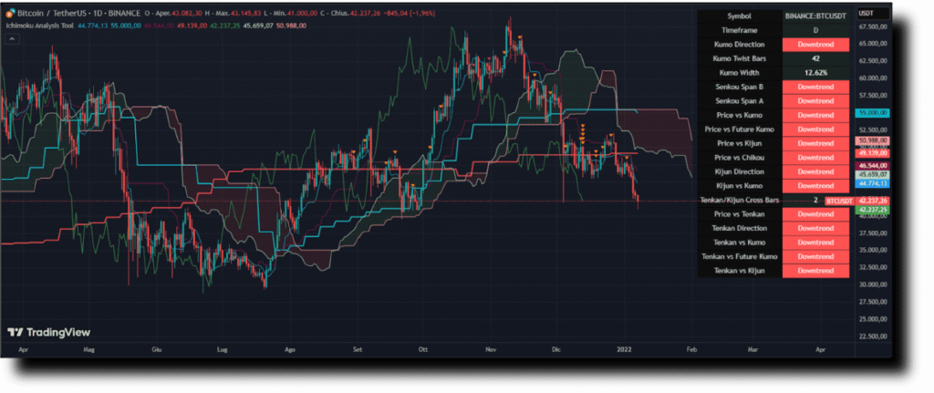 Ichimoku Trend Summary è un indicatore che aiuta il trader a interpretare rapidamente i segnali dell’Ichimoku Kinko Hyo. Mostra in una tabella la direzione e la posizione reciproca delle linee (ad esempio Tenkan sopra/sotto Kijun), segnala l’ultimo Kumo Twist e indica la larghezza percentuale della Kumo. Consigliato su grafico daily per valutare la situazione a breve, medio e lungo termine.