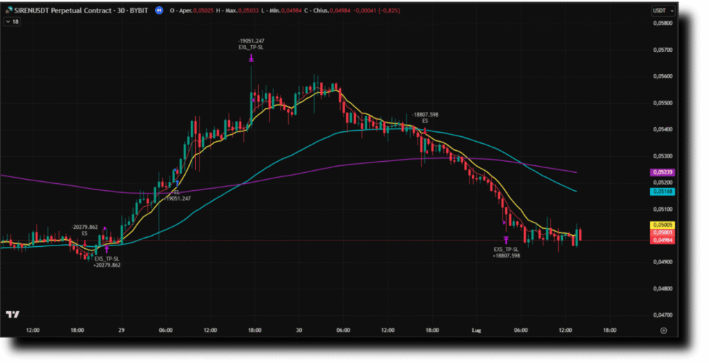 Gestione avanzata degli ingressi: L’apertura delle posizioni Long e Short avviene tramite incroci tra due EMA selezionate dall’utente, con la possibilità di aggiungere un margine percentuale di filtro.